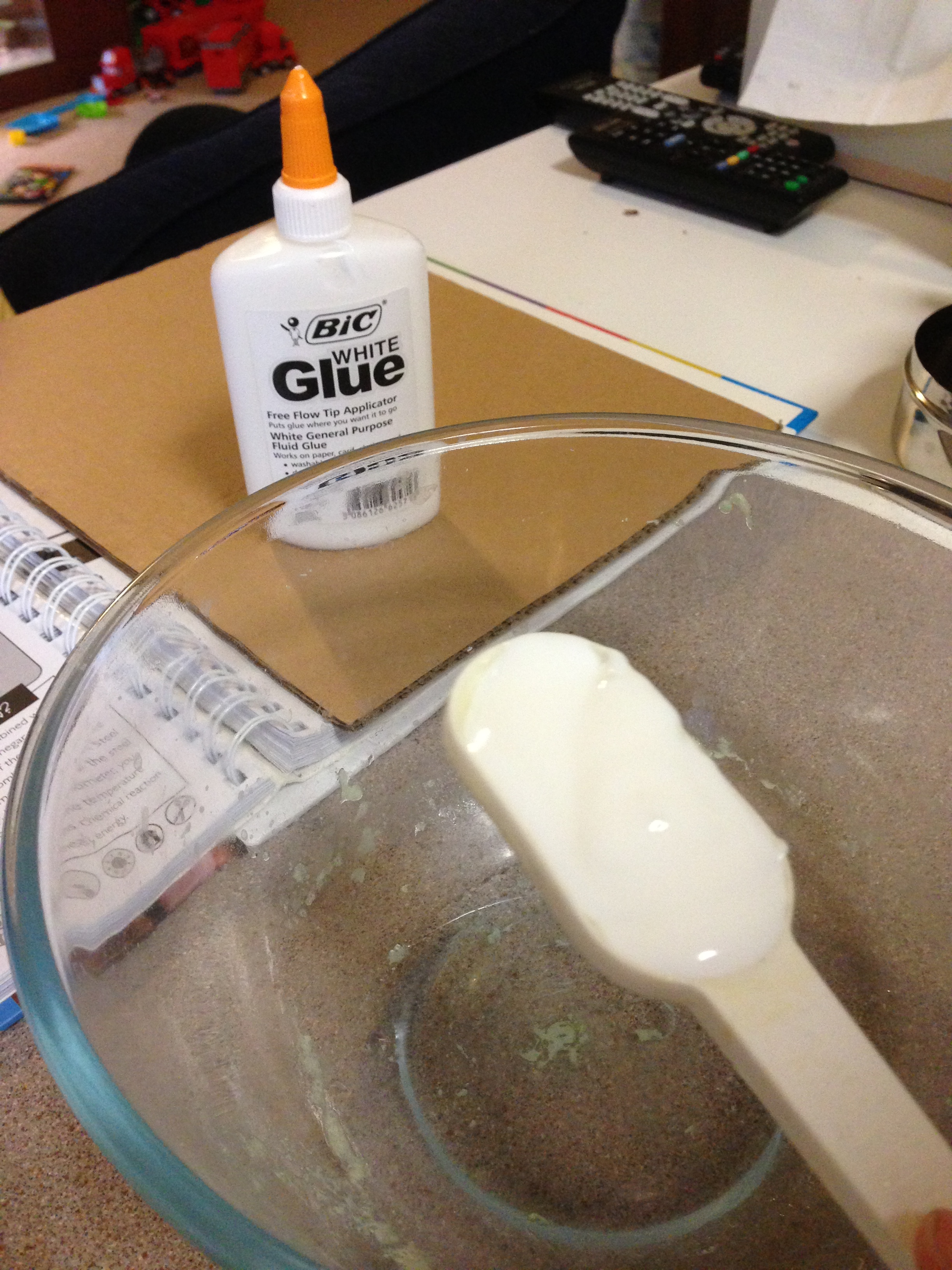 Step 1: In a container, mix together one tablespoon of glue (general craft glue), one tablespoon of water, and one drop of food colouring (Sinister chose BLUE).