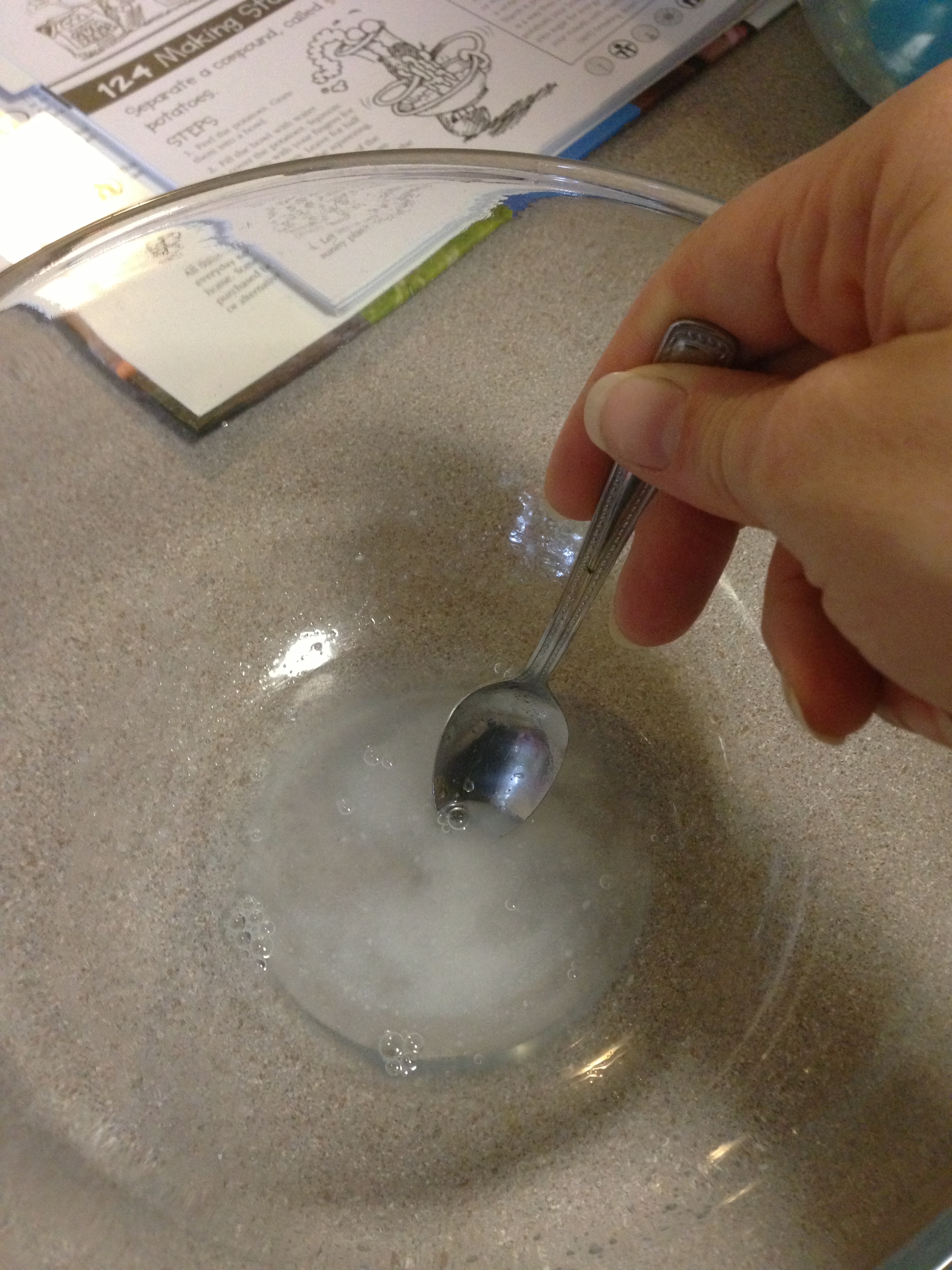 Step 2 – In a separate container, dissolve one teaspoon of borax powder in one tablespoon of warm water. Borax powder is POISONOUS – wash your hands after touching it or your slime!