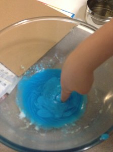 Step 3 – Pour the Borax solution into the glue mixture. Mix with your fingers and a slime should form, almost instantly. It will feel plastic-y and gooey. And awesome.