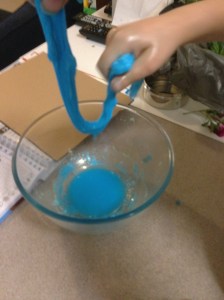And there you go! This slime is excellent. We had some extra moisture, but once you squeeze that out it becomes a little sticky and very much like malleable plastic.