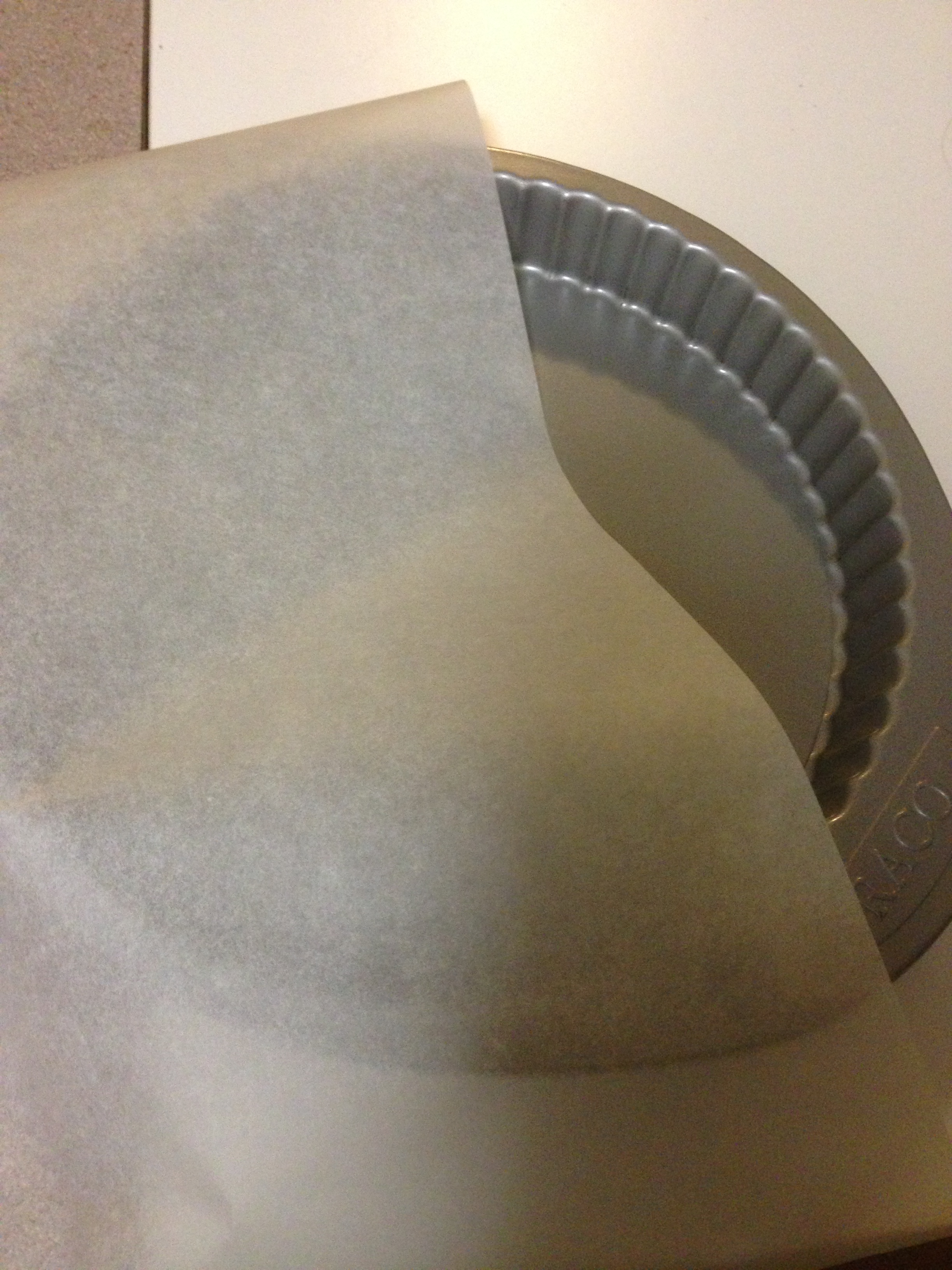 2. Line your pie dish with the waxed paper. Make sure that plenty hangs over the edge so that you can just lift the quiche out, but at the same time stop any leakage from the quiche.