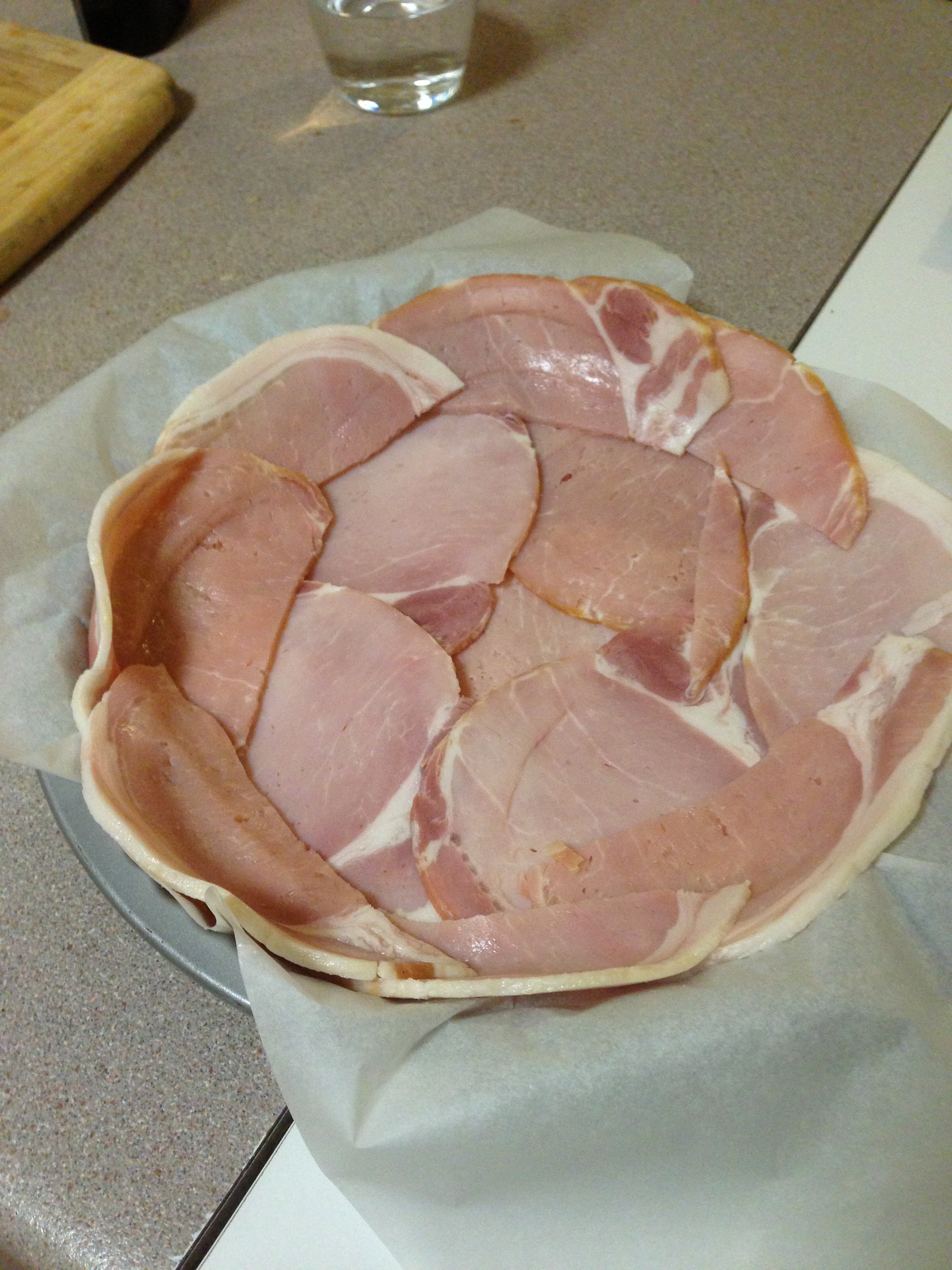 ‘lattice bacon’, however I only had short-cut bacon on hand. So I did a ‘mandala’ style layer around the bottom. Yes, the egg mixture will leak through, but it will then cook into a solid mass so it won’t matter. Dude – it’s bacon!! Just layer the damn thing!!