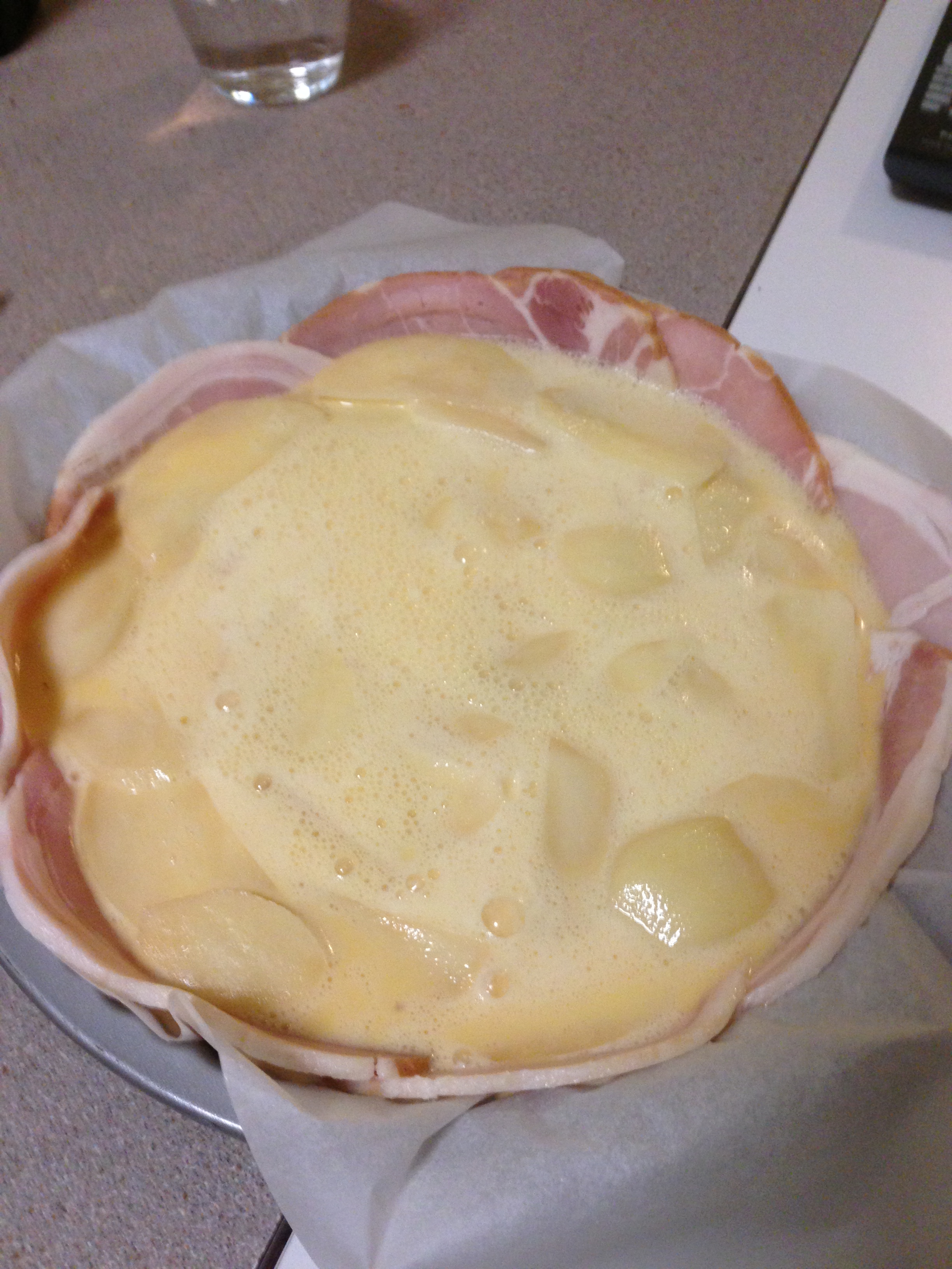 5. Layer the potato on top of the bacon, all around the dish. Again, the egg mix will work around it. I think at this stage I should have added the kale but … meh.