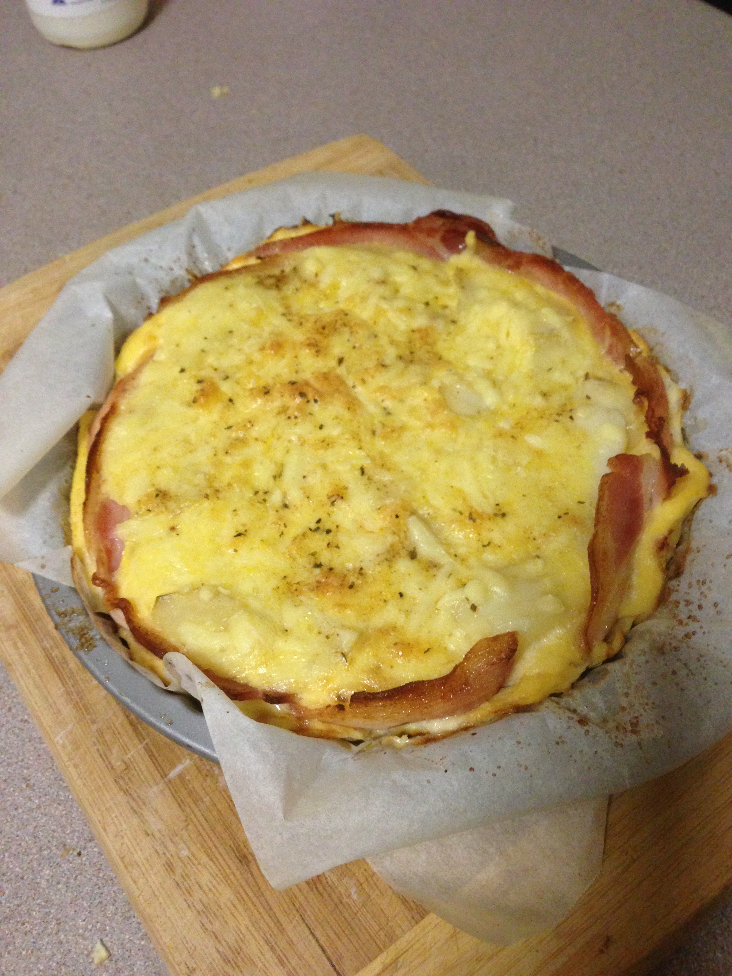 8. Cook in the oven for about 45mins. Keep checking it. You should be able to see that the bacon hanging over the edge is cooked, the egg/cheese on top has browned. I originally did 30mins but the potato needed just a little extra time.