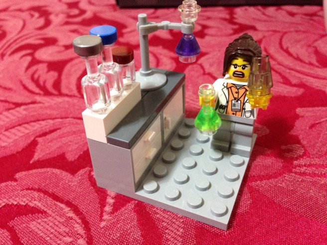 And then there is the LEGO. The chemist is awesome, with her dual face, lots of potions (that’s what Nefarious calls them) and diddly little bits that I had never considered building before DESPITE using pieces I have had since I was 5. See her hand – I never considered that the buttons of LEGO fit in the Minifigs hands!!