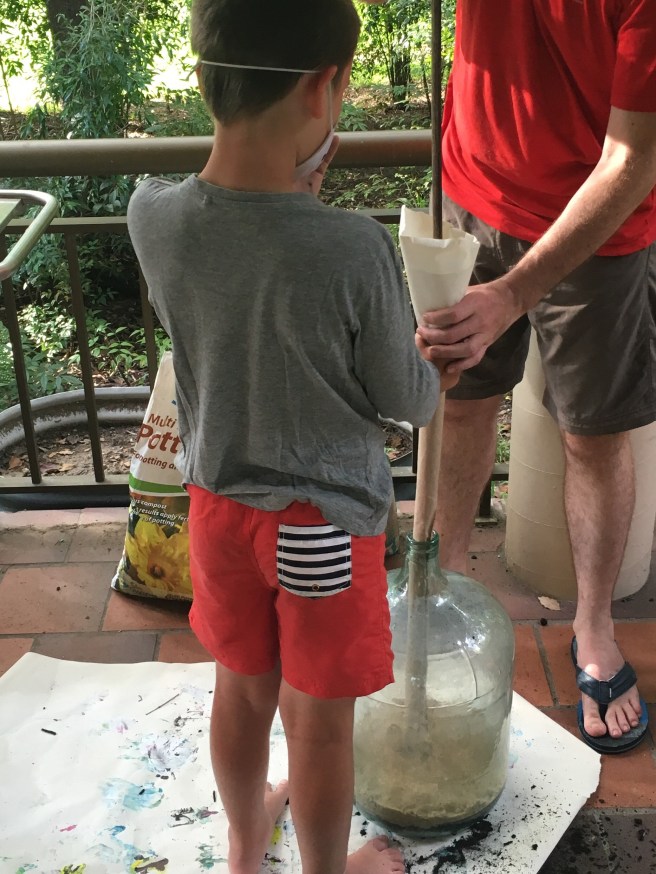 For those tuning in for the first time (slackers): Sinister has chosen to build his own self-sustaining terrarium for a science project. He has already researched what he needs and the environment he needs to create; we bought a demijohn (glass jar) and he has cleaned it up.