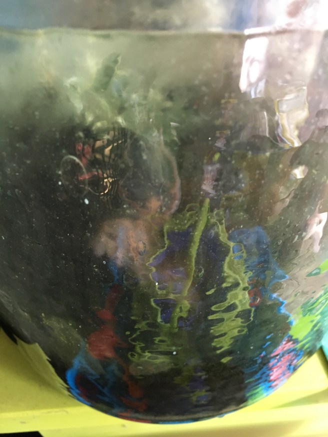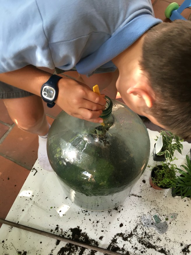 UPDATE: 12 months later – and the terrarium is still going strong. One of the plants has brown leaves but is not dead. Condensation is still cycling inside and it looks strong and healthy. Man, he really knows how to do a science project!