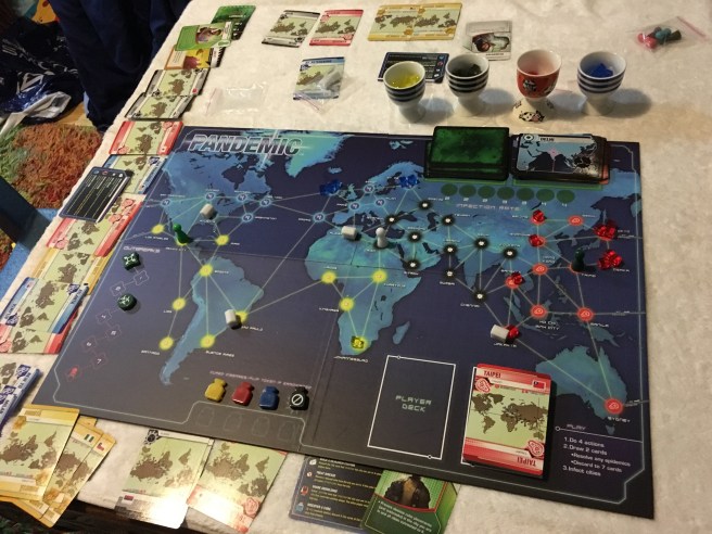 Not the ideal game for germ-a-phobes. I like this game because it is a team game; everyone works together to defeat the icky diseases breaking out across the world. There is some serious strategy building required, and a great opportunity to work on communication.
