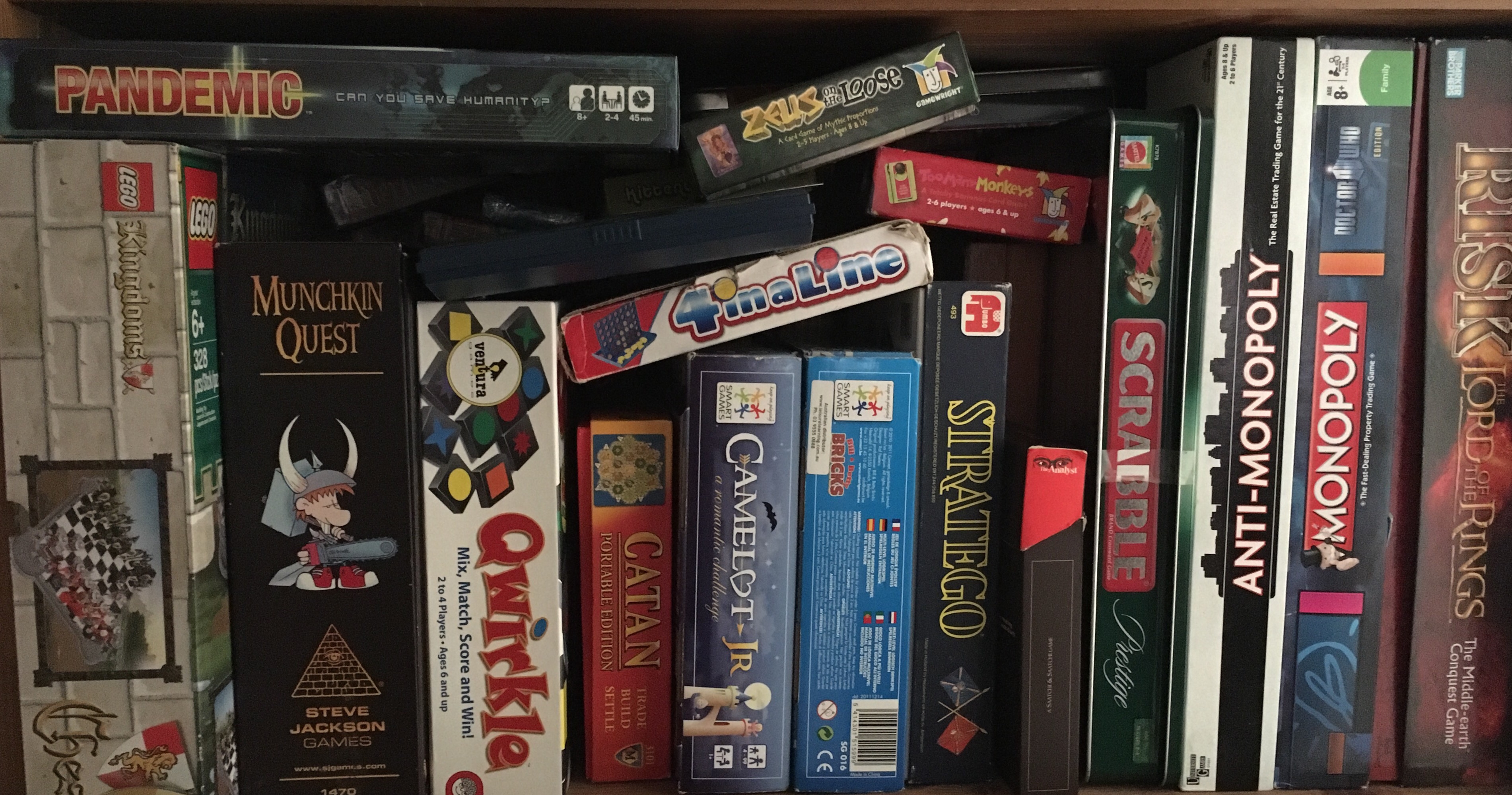 Even the 2yo can play this one (with a little help). Great strategy and pattern recognition. It starts friendly, with the shared intent of keeping the game ‘neat’ – but there is always some mongrel who has to mess the neat pattern, and then it descends into a table full of jibes and defensive moves.