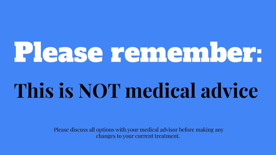Disclaimer: Yeah, it needs to be said. Please remember, this is NOT medical advice. If you feel or believe any of this may be relevant to you and your personal experience, please discuss all options with your medical advisor before making any changes to your current treatment and circumstances.