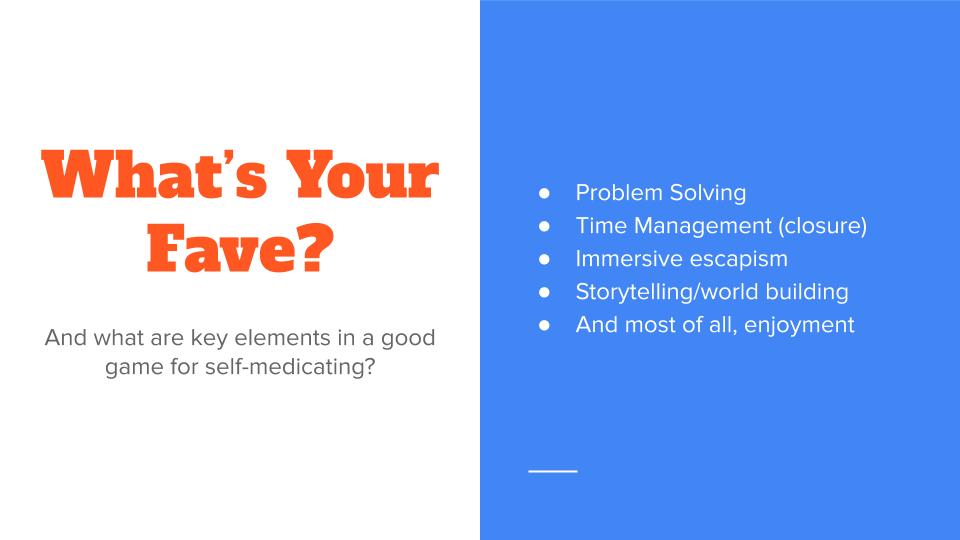 The most important thing to know is that there is nothing wrong using games to self-medicate. Nothing wrong at all. Yes, there are rules but rules are easier to work with than the guilt and stigma previously dished out. Be honest with yourself and your gaming habits. The benefits will come from that.