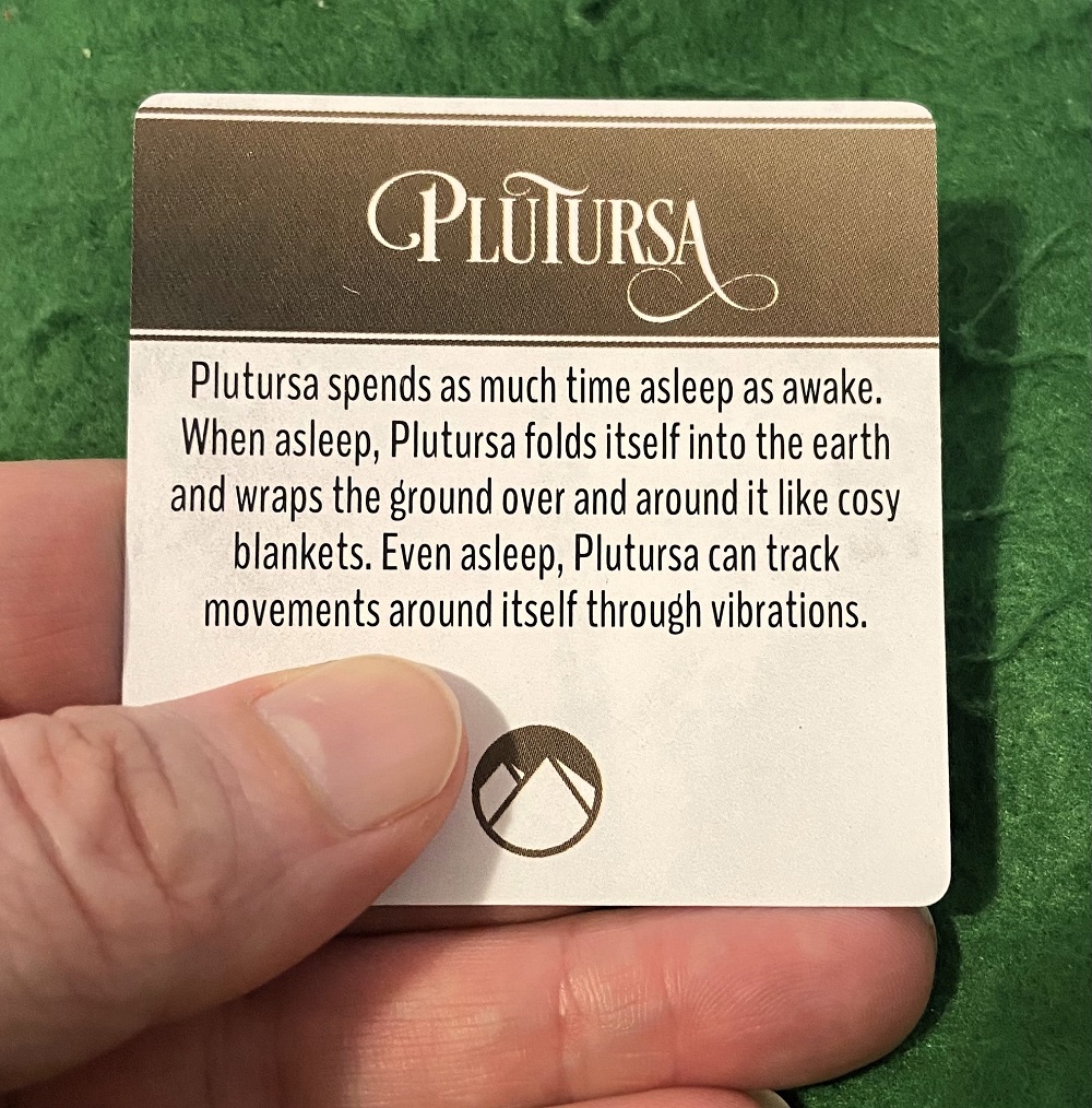 Let’s start with the core element: the cards. These are good quality, clearly printed cards–around three-quarters (¾) the size of Pokémon cards. Now, I have big truck-o-Saurus hands, and I feel very comfortable holding these cards. No cramping or complaining. They are also a good size for younger kids. However, there is little need for holding the cards, so not a big issue (more on gameplay below). The Standard Pledge also comes with a pack of card sleeves which is a great idea (unfortunately, my review copy did not). To be fair, everything in the box is great quality, including the box.