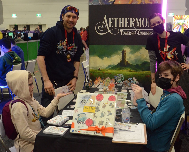 The spawnlings were the first to spot Aethermon: Tower of Darkness at PAX Aus 2022, one of my top ten recommended with GeekMom here. Currently in development, A:ToD starts off with a bit of a Pokémon feel: capturing monsters and using them to battle other monsters. However, where Pokémon is a simple battle mechanic, A:ToD is built on a strong narrative and adventure-tower mechanic. As a co-op game, you can play with 2-5 players with about an hour of gameplay. Each player chooses an elemental monster to battle with them as they ascend the Tower of Darkness and prevent the ancient evil from being unleashed. EG Family had a small taste of the battle style and the storytelling, showing some of the artwork and development. A:ToD featured in the PAX Aus 2022 Indie Showcase, and I wouldn’t be surprised if they are back for PAX Aus 2023.
