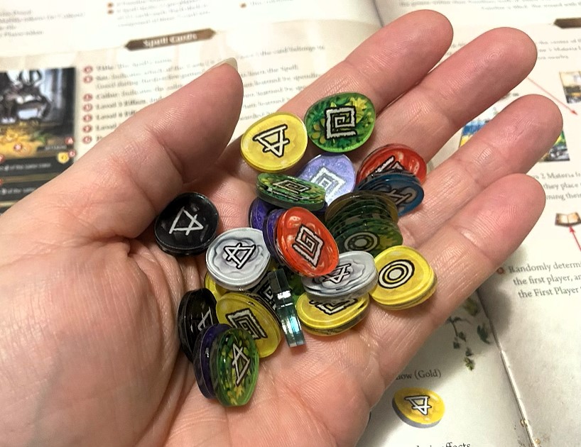 For example, the Materia. These tokens are essentially the currency of the game. There are 105 tokens in seven (7) different colours with one of three (3) different symbols on them. Each of the colours corresponds with the different elemental spells, while the symbols offer variations to each spell. The tokens are made of a thick perspex (hard plastic), very durable and protected. They are going to bounce around in the pouch, so I’m really glad to see the developers/publishers went the extra step with the protection.
