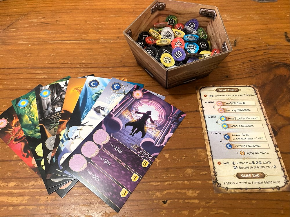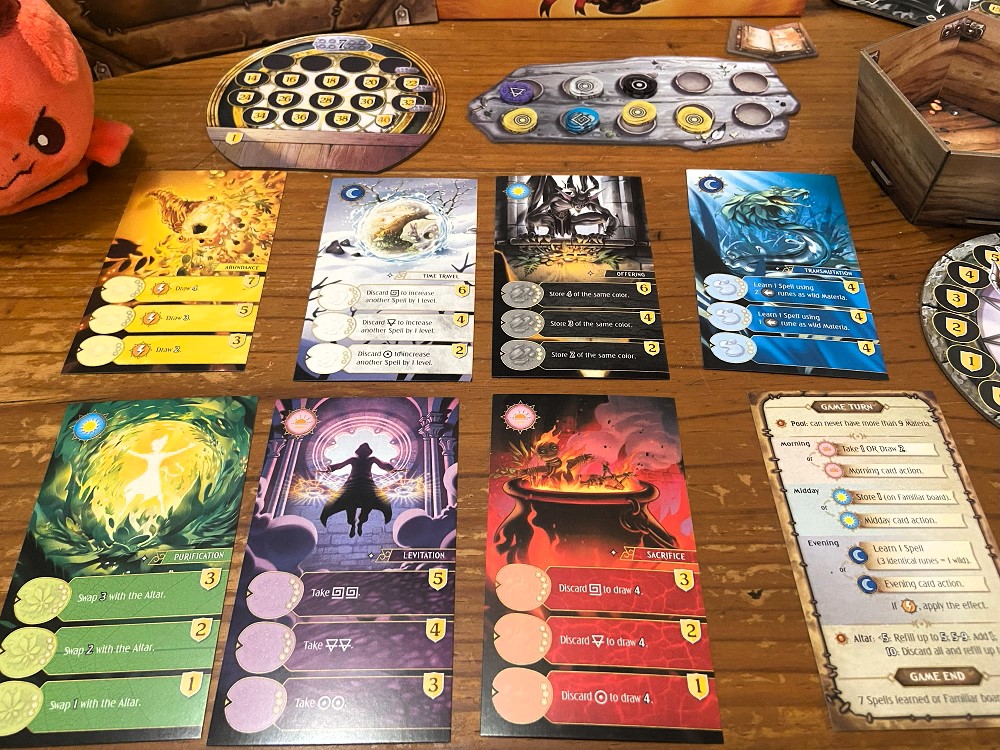 - Each player takes their deck and Player Aid card, and lays the cards in front of them in a 4×2 grid. Place your Familiar next to your spell cards.
