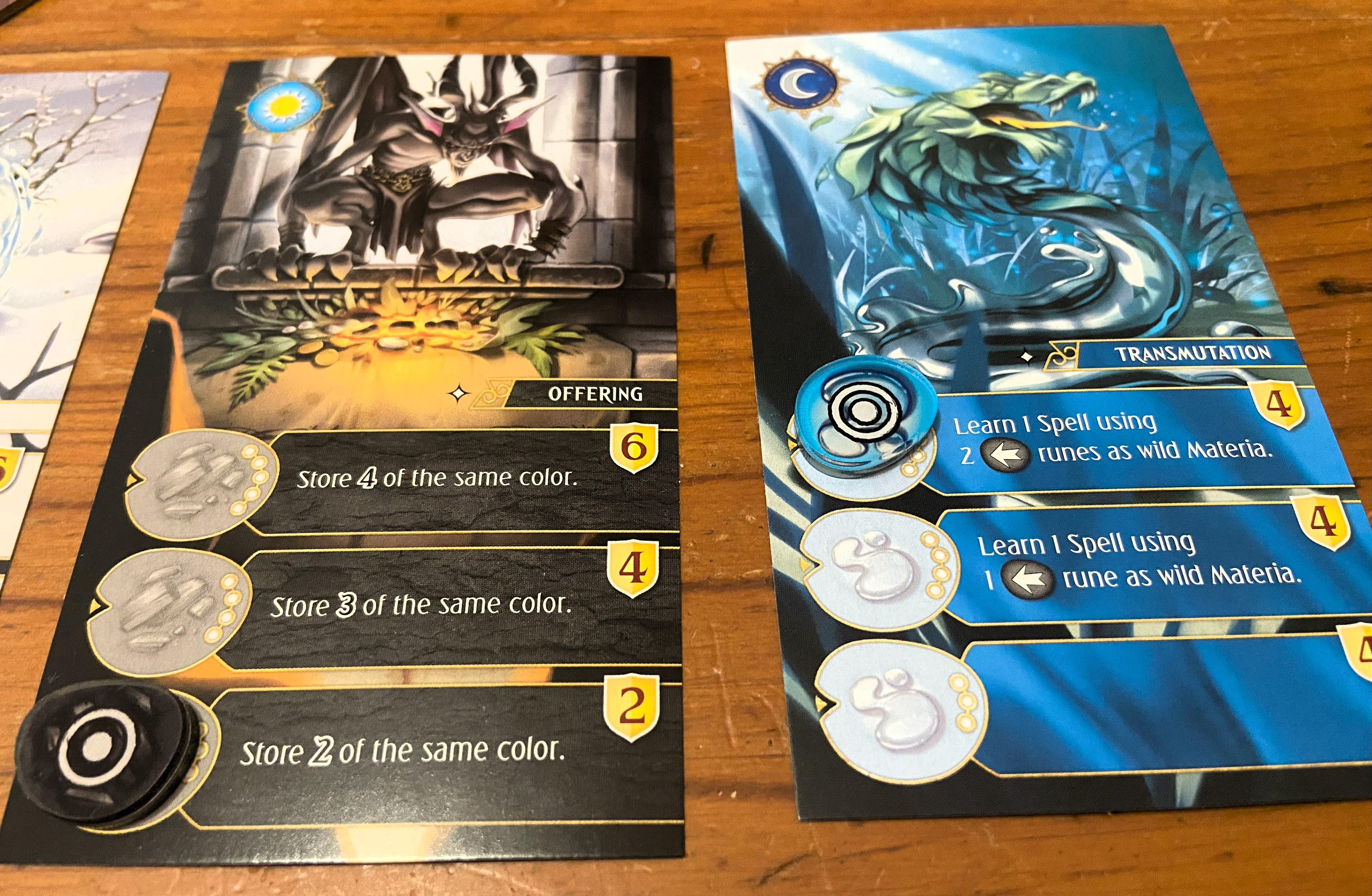 - Evening: Players may choose to learn one (1) spell, using the required Materia from their pool to do so. The Materia must match the colour of the spell to learn. One (1) Materia is placed on the Spell card to indicate which spell and which level has been learned. The remaining Materia are placed in the Discard box.