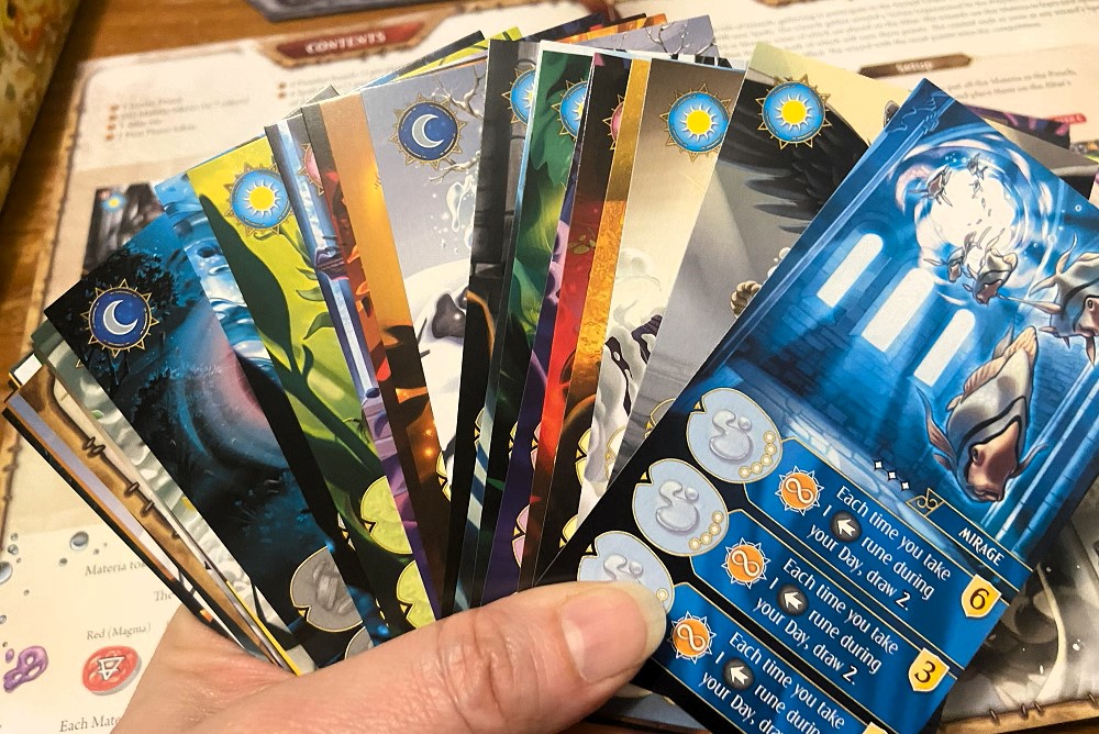 There are two ways to play Spellbook. You can play with 2-4 players in a competitive manner, which directly affects how you manage your Materia. Or you can play solo, changing your strategy to focus on your spells, working against your ‘personal best’ each time. I’m going to focus on the multiplayer here.