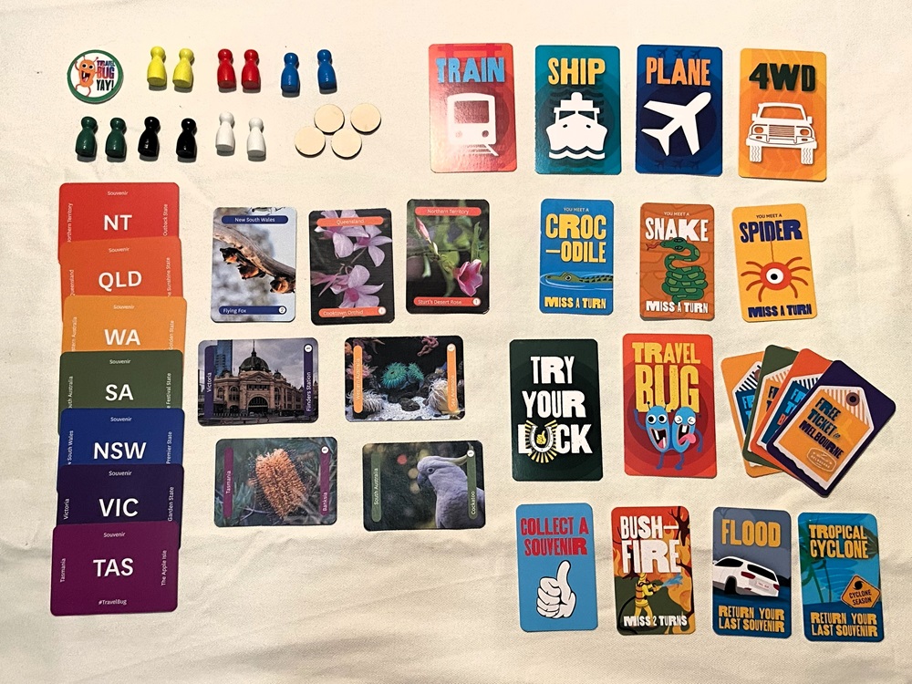 Players travel around Australia using different types of transport: 4WD, Plane, Cruise Ship, or Trains. It is good to note here that some towns do not allow certain forms of transport, so a little forward-thinking is required. As you travel around Australia, you can collect souvenirs and score points for the diversity in your collection. There are also various points for the length of your trip. Finally, there is also interference in the form of ‘bad luck’, such as a traveller’s stomach bug or other Australian hazards.
