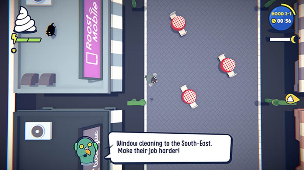 A couple of points to consider. First, the minimal save points are killing me. Each neighbourhood has four levels, and those later levels are tough. The roguelike ‘permadeath’ feature is at its most brutal when your pigeon is captured on a later level, and you start again at the beginning of the neighbourhood. As I said: Brutal. I’m okay with starting at the beginning of the level, but all the way back to the beginning of the neighbourhood? C’mon, Hojo!!