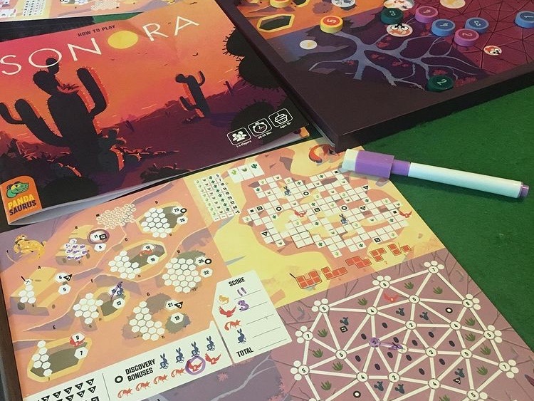 The game is a “Flick-and-Write” game designed for up to four (4) players. Each player flicks wooden discs across the board, divided into four (4) distinct areas: cliffs, canyons, creek beds, and mudcracks. Each of these areas has its own mini-game with some small features crossing over to the other areas. In one area, you use your disc points to take over cliffs in the area. In canyons, you are creating Tetris-style shapes to fill out the puzzle and collect cactus. For the third mini-game, you must follow the creek beds with various destinations, points, and bonuses. The final area has mud-cracks for you to fill and create mini zones for points. All of them are true to the desert theme with little details to round out the experience. You can play this game in a quick-and-easy manner or you can take some time to strategise across multiple areas.