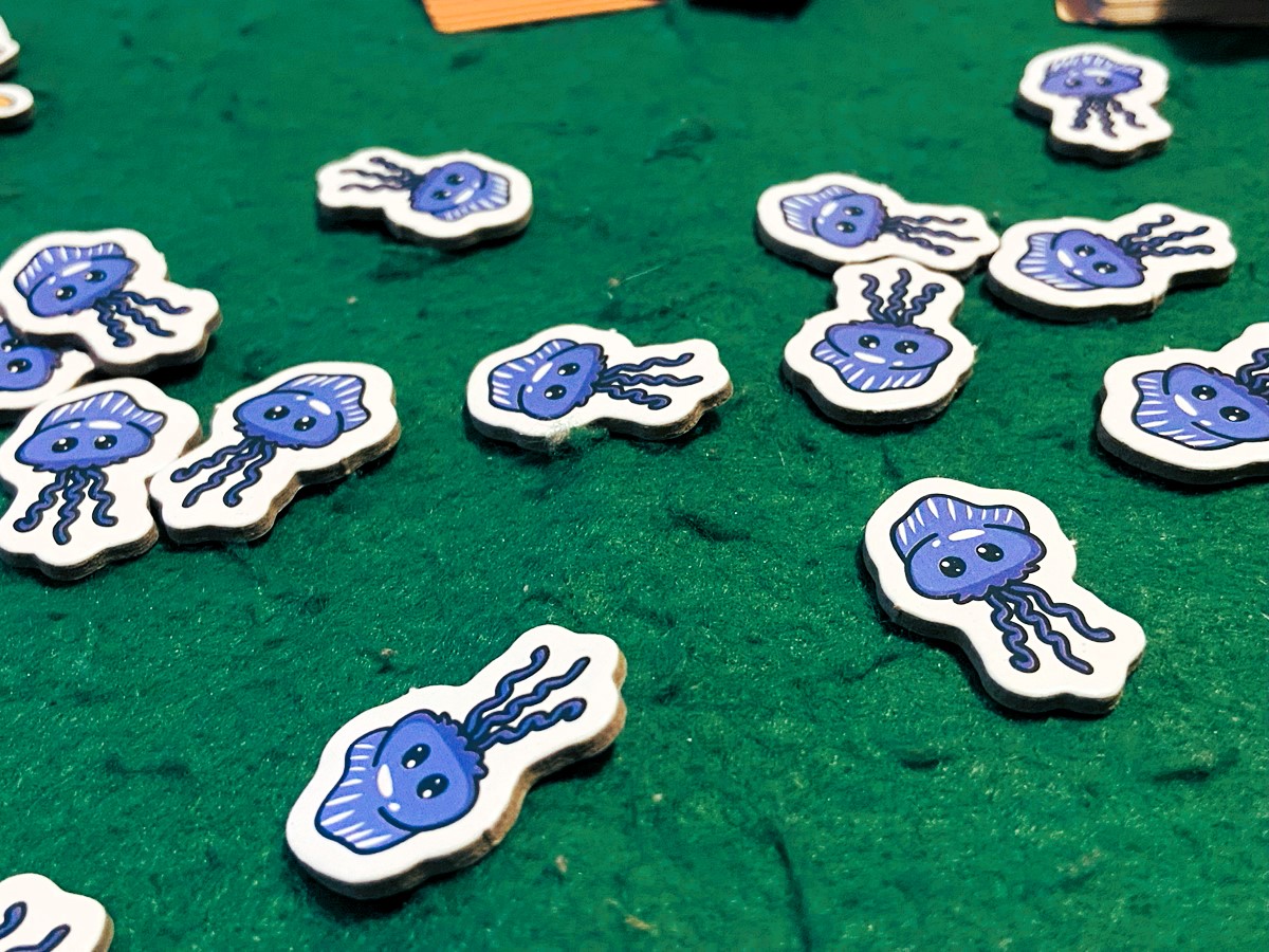 - When the dreaded Blue Bottle arrives on the beach, the goal is to NOT have the lowest energy card–you want to outswim those jelly monsters! The action is like catching a wave, but when surfers reveal their energy cards, ALL SURFERS with the lowest energy card will collect a blue bottle token. The secret number on the other side indicates the point-hit you will take at the end. There is no tie-breaker. You’re all stung.