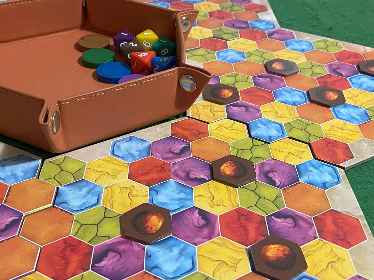 But the piece de resistance is the dice tray. You can buy dice trays almost anywhere, but this is the perfect tray for this game. It fits exactly as it should within the hexagon playmats. It clips together with clean and firm precision. It maintains the hexagon shape, characteristic of the game itself (I mean, it’s in the title). This choice was genius and is the key piece that brings the whole together. I honestly don’t think any other setup would work so beautifully.