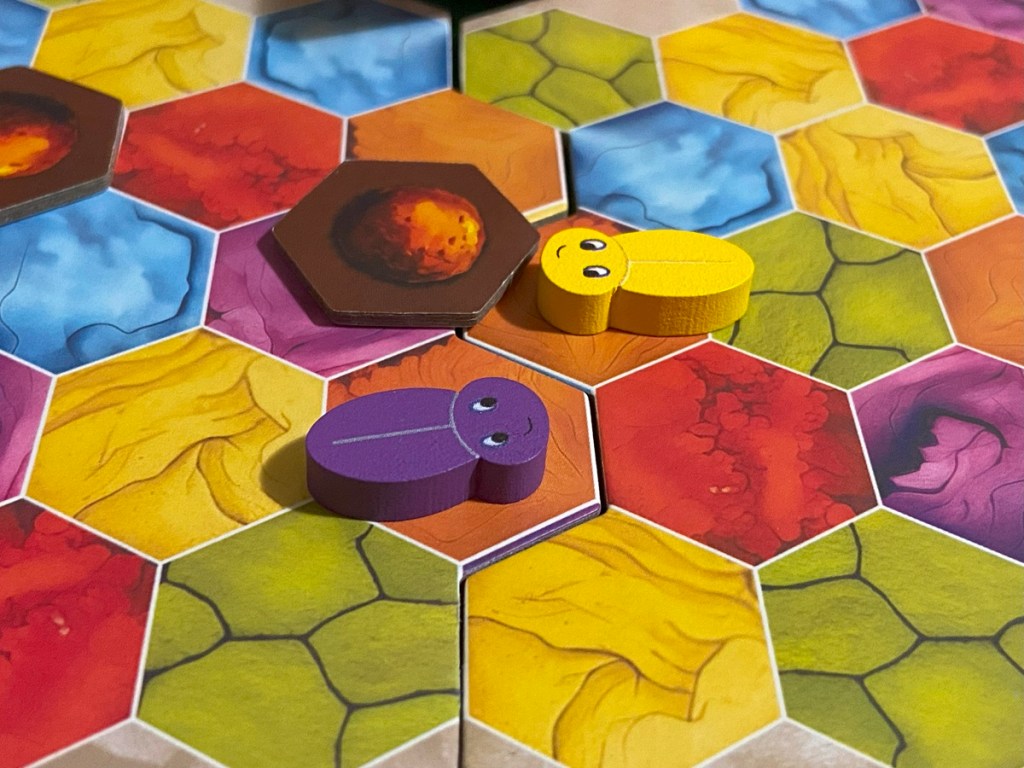 Let’s talk about game components. The developers behind Hexcrement have paid equal attention to both the game mechanics and the components. It is beautiful to play with, in both aesthetics and the craftsmanship. All cardboard components are thick and durable, with bright, colourful printing that enhances the gameplay. The dice are standard dice that will last any raucous game night, and the wooden meeples are consistent, solid, and fun.