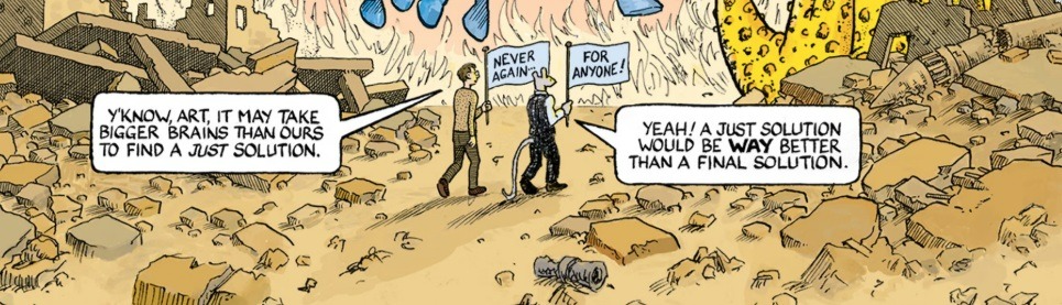 Palestine is absolutely worth reading right now. Would I give it to the spawnlings to read? Absolutely. But not in one sitting and not without some discussion along the way. Sacco’s subtlety is more powerful than many other books on the same topic, in a way that lingers and makes you think. As mentioned earlier, if I could afford to send a copy to Australian Prime Minister Albanese and NSW Premier Minns, I would. The best I can offer is a link to a cartoon featured in The Guardian (Feb 2025), co-created by Sacco and Spiegelman. For the TL; dr…