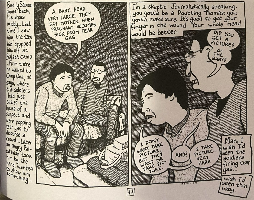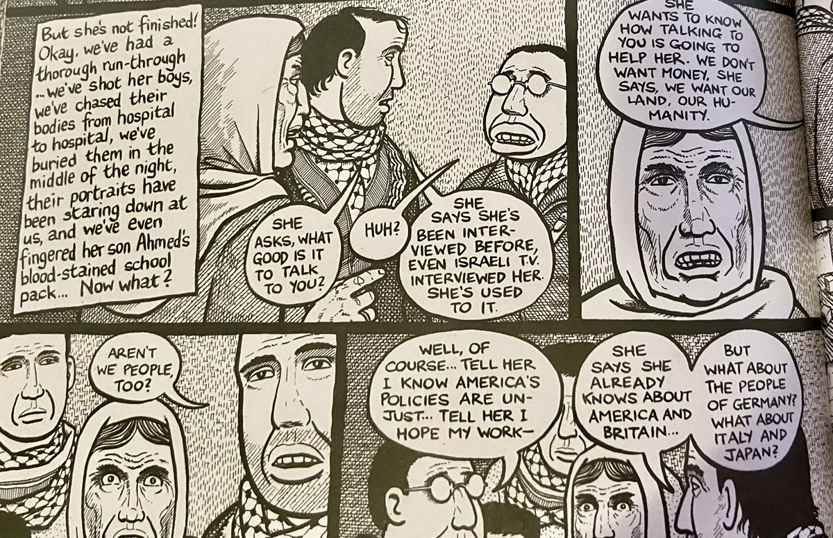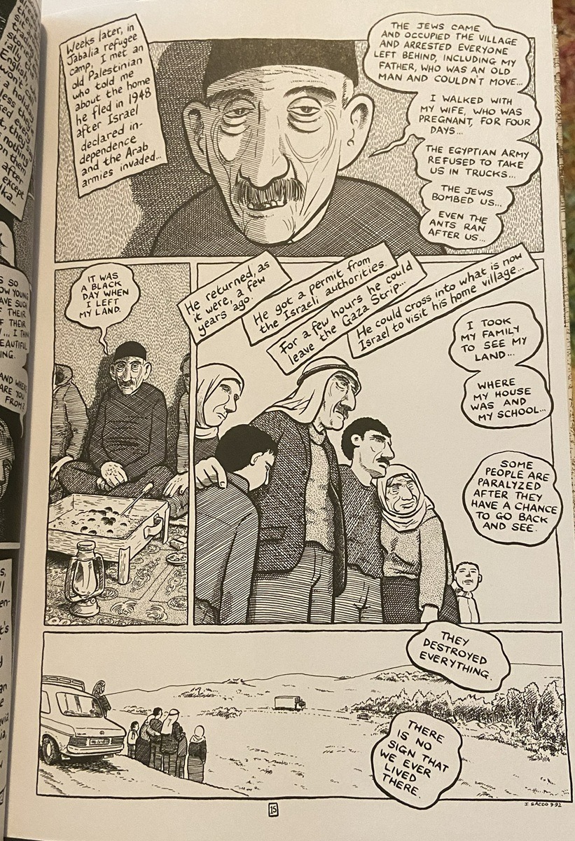 In Sacco’s own words: “Putting out a new edition of Palestine at this moment is hardly a cause for celebration. It is a book that is both out of date in its details – to be expected for a 30-year-old piece of journalism – and, sadly, all too relevant in its general scope.”